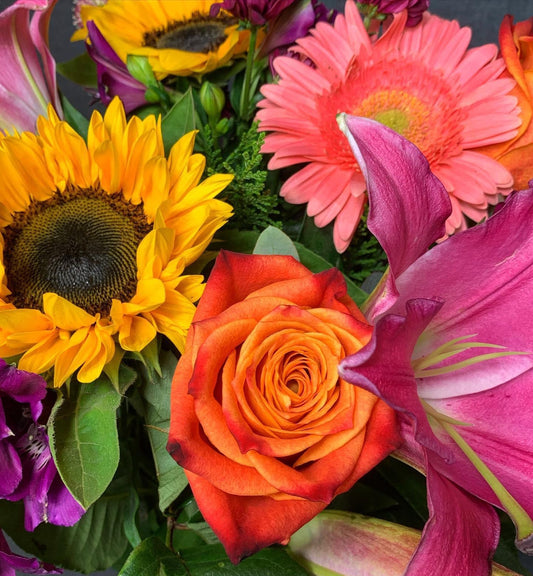 Ramos de 15 rosas rojas y 6 girasoles envuelto en papel coreano, envía flores a domicilio