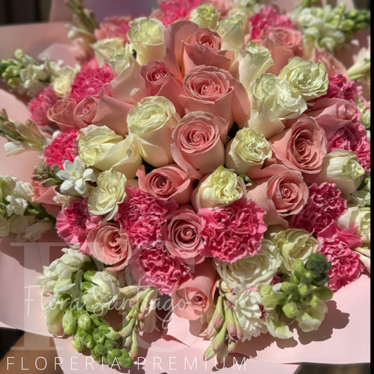 Arreglo box de rosas blancas y rosas pastel