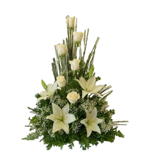 CENTRO FUNERARIO DE ROSAS LILIUM Un arreglo floral de profundo respeto y elegancia, diseñado especialmente para honrar la memoria de seres queridos. Esta composición combina rosas premium con liliums blancos, flores que simbolizan pureza, paz y renovación espiritual. Cada tallo es seleccionado cuidadosamente por nuestros floristas expertos para garantizar frescura y belleza duradera. El arreglo presenta una estructura simétrica que transmite serenidad y dignidad, ideal para servicios funerarios, velatorios o como gesto de condolencias. Disponible en diferentes tamaños según sus necesidades. Entrega a domicilio en Santiago con atención personalizada y discreción.