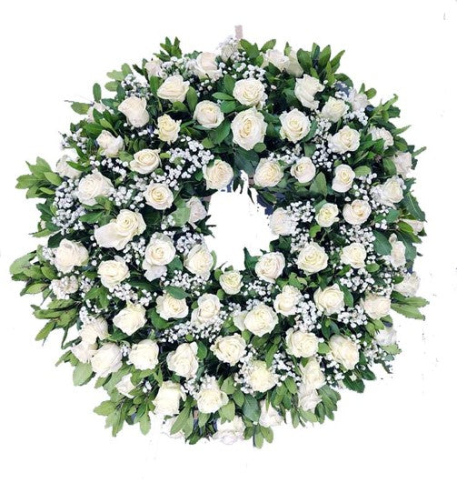 CORONA DE 100 ROSAS Y GYPSUPHILIA Tributo floral de gran impacto visual compuesto por 100 rosas premium seleccionadas cuidadosamente, complementadas con gypsophilia que aporta elegancia y movimiento. Esta corona destaca por su volumen generoso y su estructura circular perfecta, ideal para ceremonias, homenajes y momentos de significado especial. Cada rosa es procesada con técnicas profesionales para garantizar frescura y durabilidad extendida. La combinación de tonalidades y texturas crea una presentación sofisticada que transmite respeto y admiración.