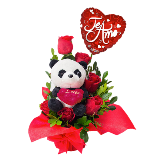 Ramo espiral de 6 rosas premium acompañadas de un adorable osito de peluche y un globo decorativo. Esta composición combina la elegancia de flores frescas con detalles tiernos que la hacen perfecta para expresar amor, cariño o celebrar momentos especiales. Ideal para sorprender a alguien querido con un regalo sofisticado y emotivo que perdurará en la memoria. Cada detalle está cuidadosamente seleccionado para garantizar una presentación impecable y de calidad premium.