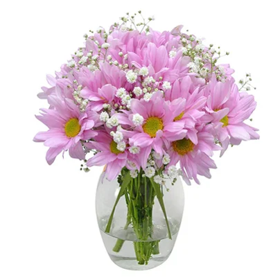 Delicadas margaritas lila en un elegante florerito de cerámica, perfectas para iluminar cualquier espacio con su belleza natural y tonalidades suaves. Este arreglo floral combina la frescura de flores recién cortadas con una presentación refinada, ideal para decoración del hogar, oficina o como regalo especial. Las margaritas lila simbolizan elegancia y serenidad, manteniendo su esplendor durante días con los cuidados básicos.