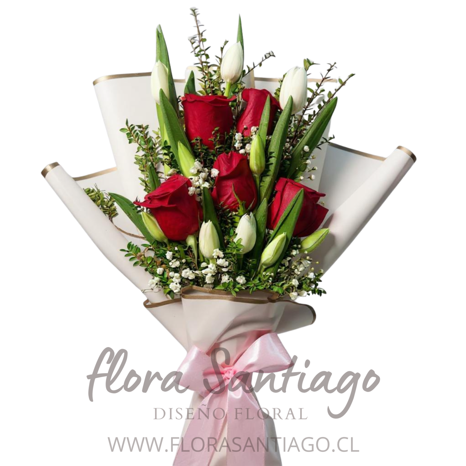Este ramo incluye 10 tulipanes y 5 rosas rojas, perfecto para expresar amor y felicidad. Los tulipanes simbolizan la alegría y los colores vibrantes, mientras que las rosas rojas expresan pasión y amor intenso. Un regalo ideal para cualquier ocasión especial.