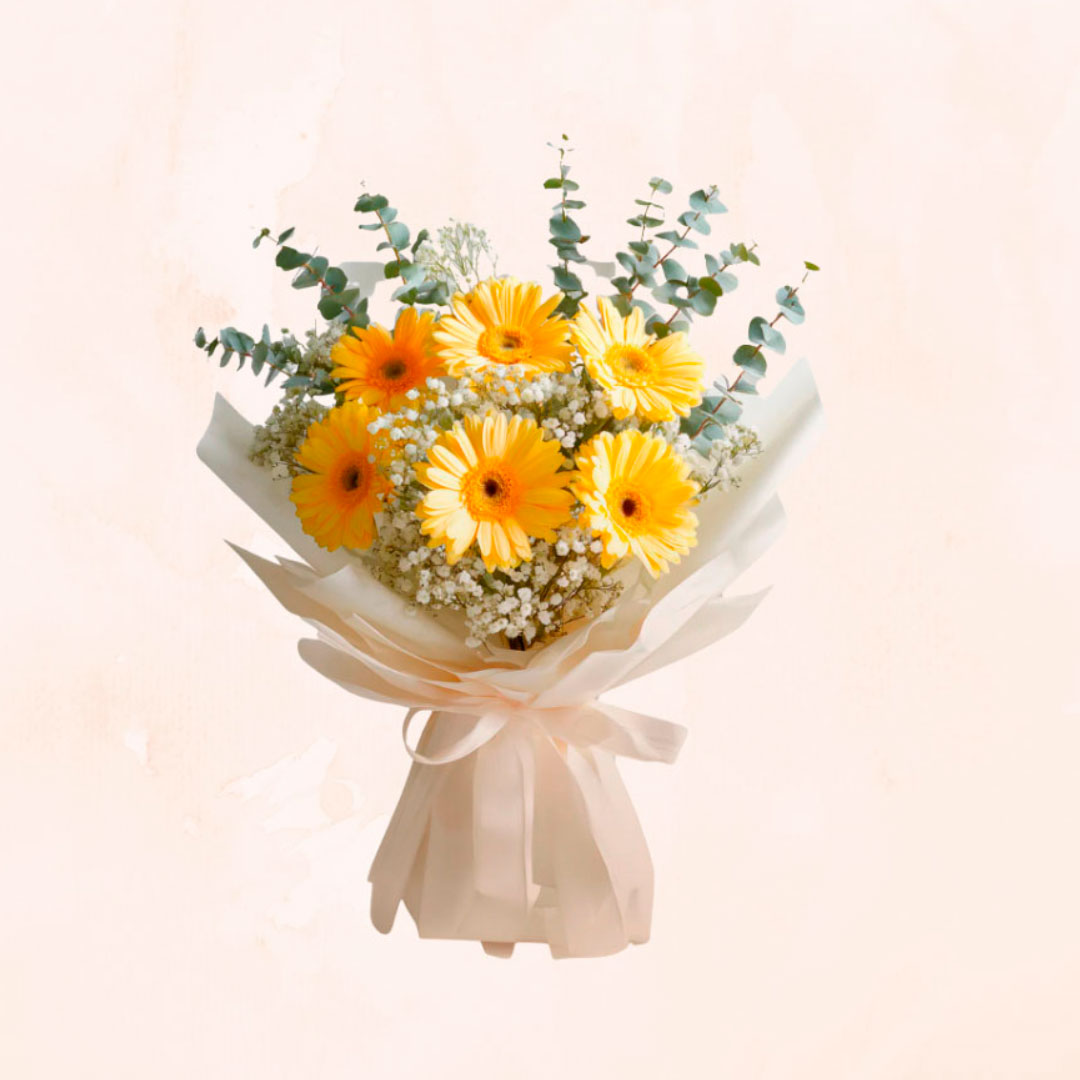 Ramo de 6 gerberas amarillas de primera calidad, seleccionadas por su tamaño y vitalidad. Estas flores destacan por sus pétalos vibrantes y su larga durabilidad en florero, perfectas para iluminar cualquier espacio con calidez y alegría. Ideal para expresar optimismo, gratitud o simplemente alegrar el día de alguien especial. Cada gerbera es cuidadosamente preparada para garantizar frescura y belleza desde el momento de la entrega.
